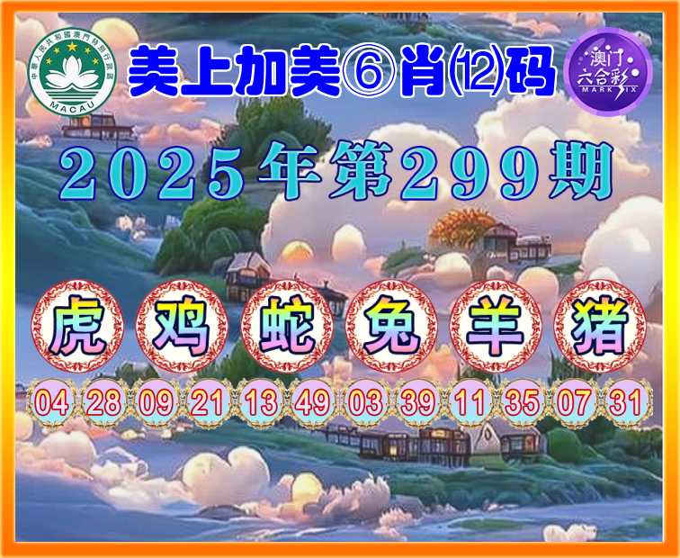 299期: 『美上加美』 ⑥肖⑿码【虎鸡兔羊猪】开:蛇49